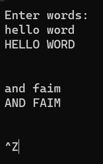 #include <iostream> #include <string> int main() { using namespace std; string s; cout << "Enter words: \n"; //重复录入字符串,将小写字符转换为大写,直到按下ctrl+z while (getline(cin, s)) { for (auto& ch : s) ch = toupper(ch); cout << s << "\n"; } }