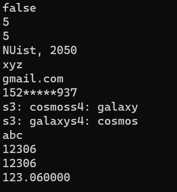 #include <iostream> #include <string> int main() { using namespace std; string s1, s2; s1 = "nuist"; s1[0] = 'N'; s1.at(1) = 'U'; cout << boolalpha << (s1 == "nuist") << endl; cout << s1.length() << endl; cout << s1.size() << endl; s2 = s1 + ", 2050"; cout << s2 << endl; string email{ "xyz@gmail.com" }; auto pos = email.find("@"); if (pos == string::npos) cout << "illegal email address"; else { auto s1 = email.substr(0, pos); auto s2 = email.substr(pos + 1); cout << s1 << endl; cout << s2 << endl; } string phone{ "15216982937" }; cout << phone.replace(3, 5, string(5, '*')) << endl; string s3{ "cosmos" }, s4{ "galaxy" }; cout << "s3: " + s3 + "s4: " + s4 << endl; s3.swap(s4); cout << "s3: " + s3 + "s4: " + s4 << endl; string s5{ "abc" }; const char* pstr = s5.c_str(); cout << pstr << endl; string s6{ "12306" }; int x1 = stoi(s6); cout << x1 << endl; int x2 = 12306; string s7 = to_string(x2); cout << s7 << endl; double x3 = 123.06; string s8 = to_string(x3); cout << s8 << endl; }