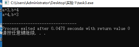 #include <stdio.h> int main() { int a,b,t; a=3; b=4; printf("a=%d,b=%d\n",a,b); t=a; a=b; b=t; printf("a=%d,b=%d\n",a,b); return 0; }