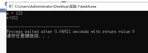 #include <stdio.h> int main() { int x,t,m; x=123; printf("x = %d\n",x); t=0; m=x%10; t=t*10+m; x=x/10; m=x%10; t=t*10+m; x=x/10; m=x%10; t=t*10+m; x=x/10; printf("t=%d\n",t); return 0; }