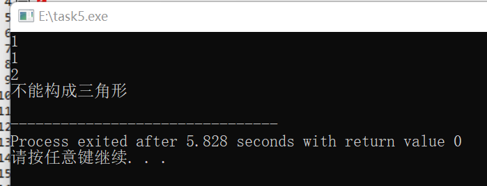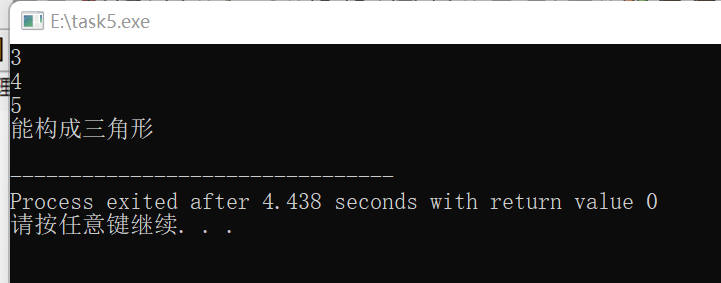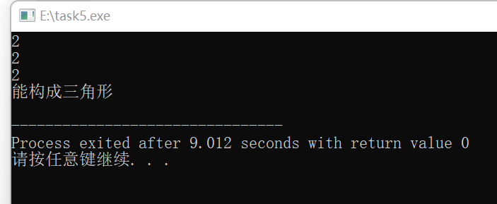 #include <stdio.h> int main() { float a,b,c; scanf("%f%f%f",&a,&b,&c); if((a+b>c&&b+c>a&&c+a>b)) printf("能构成三角形\n"); else printf("不能构成三角形\n"); return 0; }