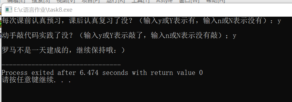 #include <stdio.h> int main() { char ans1,ans2; printf("每次课前认真预习,课后认真复习了没?(输入y或Y表示有,输入n或N表示没有):"); ans1 =getchar(); getchar(); printf("\n动手敲代码实践了没?(输入y或Y表示敲了,输入n或N表示没有敲);"); ans2 = getchar(); if (ans1 == 'Y'||ans1 =='y' && ans2 =='Y'||ans2=='y') printf("\n罗马不是一天建成的,继续保持哦:)\n"); else printf("\n罗马不是一天毁灭的,我们来建设吧\n"); return 0; }