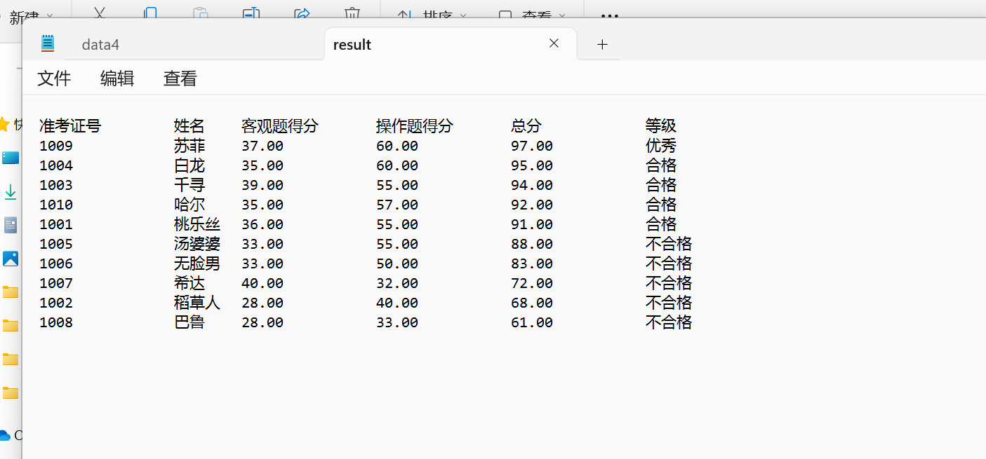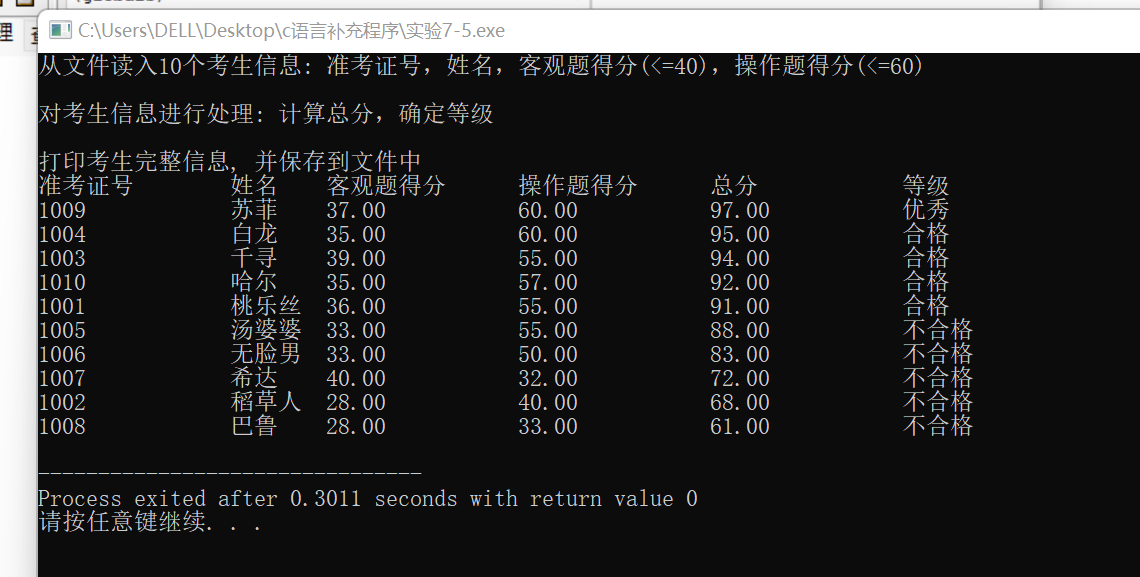 #include <stdio.h> #include <string.h> #include <stdlib.h> #define N 10 typedef struct { long int id; char name[20]; float objective; // 客观题得分 float subjective; // 操作题得分 float sum; char level[10]; } STU; // 函数声明 void input(STU s[], int n); void output(STU s[], int n); void process(STU s[], int n); int main() { STU stu[N]; printf("从文件读入%d个考生信息: 准考证号,姓名,客观题得分(<=40),操作题得分(<=60)\n", N); input(stu, N); printf("\n对考生信息进行处理: 计算总分,确定等级\n"); process(stu, N); printf("\n打印考生完整信息, 并保存到文件中"); output(stu, N); return 0; } // 从文本文件examinee.txt读入考生信息:准考证号,姓名,客观题得分,操作题得分 void input(STU s[], int n) { int i; FILE *fin; fin = fopen("examinee.txt", "r"); if (fin == NULL) { printf("fail to open file\n"); exit(0); } while (!feof(fin)) { for (i = 0; i < n; i++) fscanf(fin, "%ld %s %f %f", &s[i].id, s[i].name, &s[i].objective, &s[i].subjective); } fclose(fin); } // 输出考生完整信息: 准考证号,姓名,客观题得分,操作题得分,总分,等级 // 不仅输出到屏幕上,还写到文本文件result.txt中 void output(STU s[], int n) { FILE *fout; int i; // 输出到屏幕 printf("\n"); printf("准考证号\t姓名\t客观题得分\t操作题得分\t总分\t\t等级\n"); for (i = 0; i < n; i++) printf("%ld\t\t%s\t%.2f\t\t%.2f\t\t%.2f\t\t%s\n", s[i].id, s[i].name, s[i].objective, s[i].subjective, s[i].sum, s[i].level); // 保存到文件 fout = fopen("result.txt", "w"); if (!fout) { printf("fail to open or create result.txt\n"); exit(0); } fprintf(fout, "准考证号\t\t姓名\t客观题得分\t操作题得分\t总分\t\t等级\n"); for (i = 0; i < n; i++) fprintf(fout, "%ld\t\t%s\t%.2f\t\t%.2f\t\t%.2f\t\t%s\n", s[i].id, s[i].name, s[i].objective, s[i].subjective, s[i].sum, s[i].level); fclose(fout); } // 对考生信息进行处理:计算总分,排序,确定等级 void process(STU s[], int n) { // 补足代码 for (int i = 0; i < n; i++) { s[i].sum = s[i].objective + s[i].subjective; } STU temp; for (int i = 0; i < n - 1; i++) { for (int j = 0; j < n - i - 1; j++) { if (s[j].sum < s[j + 1].sum) { temp.id = s[j].id; temp.objective = s[j].objective; temp.subjective = s[j].subjective; temp.sum = s[j].sum; strcpy(temp.level, s[j].level); strcpy(temp.name, s[j].name); s[j].id = s[j + 1].id; s[j].objective = s[j + 1].objective; s[j].subjective = s[j + 1].subjective; s[j].sum = s[j + 1].sum; strcpy(s[j].level, s[j + 1].level); strcpy(s[j].name, s[j + 1].name); s[j + 1].id = temp.id; s[j + 1].objective = temp.objective; s[j + 1].subjective = temp.subjective; s[j + 1].sum = temp.sum; strcpy(s[j + 1].level, temp.level); strcpy(s[j + 1].name, temp.name); } } } for (int i = 0; i < n; i++) { if ((i + 1) <= n * 0.1) { strcpy(s[i].level, "优秀"); } else if ((i + 1) <= n * 0.5) { strcpy(s[i].level, "合格"); } else { strcpy(s[i].level, "不合格"); } } }