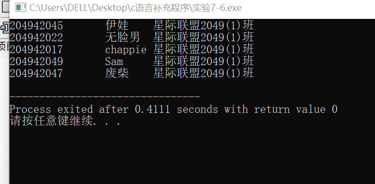 #include <stdio.h> #include <string.h> #include <stdlib.h> #include <time.h> #define N 80 #define NCHOOSE 5 typedef struct { long int id; char name[20]; char className[100]; } STU; void input(STU s[], int n); void process(STU stu[], STU stuChoose[], int n); void output(STU s[], int n); int main() { STU stu[N]; STU stuChoose[NCHOOSE]; input(stu, N); process(stu, stuChoose, N); output(stuChoose, NCHOOSE); return 0; } void input(STU s[], int n) { int i; FILE *fin; fin = fopen("list.txt", "r"); if (fin == NULL) { printf("fail to open file\n"); exit(0); } while (!feof(fin)) { for (i = 0; i < n; i++) fscanf(fin, "%ld %s %s\n", &s[i].id, s[i].name, s[i].className); } fclose(fin); } void output(STU s[], int n) { FILE *fout; int i; for (i = 0; i < n; i++) printf("%ld %s %s\n", s[i].id, s[i].name, s[i].className); fout = fopen("lucky.txt", "w"); if (!fout) { printf("fail to open or create result.txt\n"); exit(0); } for (i = 0; i < n; i++) fprintf(fout, "%ld %s %s\n", s[i].id, s[i].name, s[i].className); fclose(fout); } void process(STU stu[], STU stuChoose[], int n) { srand(time(NULL)); int nums[NCHOOSE] = {-1}; int temp, i, j; for (i = 0; i < NCHOOSE; i++) { temp = rand() % 80; for (j = 0; j < i; j++) { if (nums[j] == temp) { i--; break; } } if (j == i) { nums[i] = temp; } } for (int i = 0; i < NCHOOSE; i++) { stuChoose[i].id = stu[nums[i]].id; strcpy(stuChoose[i].className, stu[nums[i]].className); strcpy(stuChoose[i].name, stu[nums[i]].name); } }