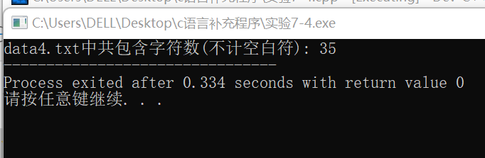 #include <stdio.h> #include <ctype.h> int main() { FILE *fp; char ch; int count = 0; fp = fopen("data4.txt", "r"); while ((ch = fgetc(fp)) != EOF) { if (!isspace(ch)) { count++; } } fclose(fp); printf("data4.txt中共包含字符数(不计空白符): %d", count); return 0; }
