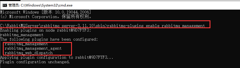 2) 打开CMD执行命令 rabbitmq-plugins enable rabbitmq_management 看到启动了一下三项,然后执行 rabbitmqctl start_app,即启动成功