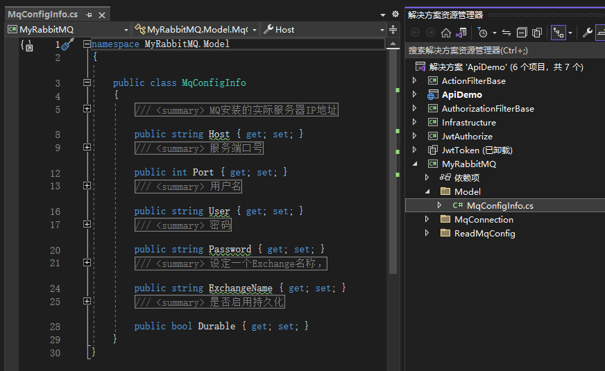 1 public class MqConfigInfo 2 { 3 /// <summary> 4 /// MQ安装的实际服务器IP地址 5 /// </summary> 6 public string Host { get; set; } 7 /// <summary> 8 /// 服务端口号 9 /// </summary> 10 public int Port { get; set; } 11 /// <summary> 12 /// 用户名 13 /// </summary> 14 public string User { get; set; } 15 /// <summary> 16 /// 密码 17 /// </summary> 18 public string Password { get; set; } 19 /// <summary> 20 /// 设定一个Exchange名称, 21 /// </summary> 22 public string ExchangeName { get; set; } 23 /// <summary> 24 /// 是否启用持久化 25 /// </summary> 26 public bool Durable { get; set; } 27 }