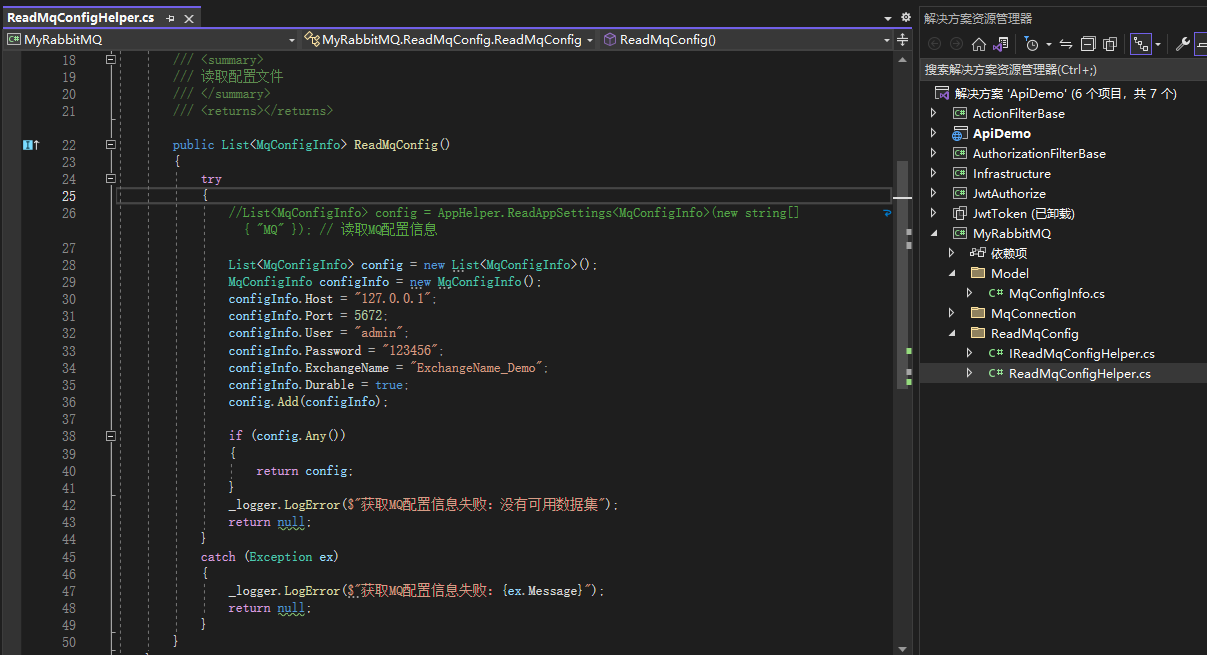 1 private readonly ILogger<ReadMqConfigHelper> _logger; 2 public ReadMqConfigHelper(ILogger<ReadMqConfigHelper> logger) 3 { 4 _logger = logger; 5 } 6 /// <summary> 7 /// 读取配置文件 8 /// </summary> 9 /// <returns></returns> 10 public List<MqConfigInfo> ReadMqConfig() 11 { 12 try 13 { 14 //List<MqConfigInfo> config = AppHelper.ReadAppSettings<MqConfigInfo>(new string[] { "MQ" }); // 读取MQ配置信息 15 16 List<MqConfigInfo> config = new List<MqConfigInfo>(); 17 MqConfigInfo configInfo = new MqConfigInfo(); 18 configInfo.Host = "127.0.0.1"; 19 configInfo.Port = 5672; 20 configInfo.User = "admin"; 21 configInfo.Password = "123456"; 22 configInfo.ExchangeName = "ExchangeName_Demo"; 23 configInfo.Durable = true; 24 config.Add(configInfo); 25 26 if (config.Any()) 27 { 28 return config; 29 } 30 _logger.LogError($"获取MQ配置信息失败:没有可用数据集"); 31 return null; 32 } 33 catch (Exception ex) 34 { 35 _logger.LogError($"获取MQ配置信息失败:{ex.Message}"); 36 return null; 37 } 38 }