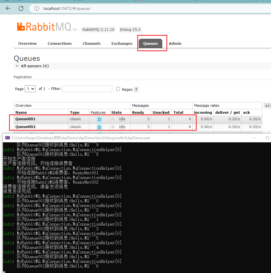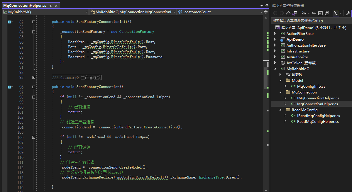 1 private readonly IMqConnectionHelper _mqConnection; 2 private readonly IReadMqConfigHelper _mqConfigHelper; 3 public RabbitMQController(IMqConnectionHelper mqConnection, IReadMqConfigHelper mqConfigHelper) 4 { 5 _mqConnection = mqConnection; 6 _mqConfigHelper = mqConfigHelper; 7 } 8 9 [HttpGet] 10 public Task StartAsync(CancellationToken token) 11 { 12 InitRabbitMQConnection(); 13 return Task.CompletedTask; 14 } 15 16 private void InitRabbitMQConnection() 17 { 18 //读取配置信息 19 MqConnectionHelper._mqConfig = _mqConfigHelper.ReadMqConfig(); 20 21 Console.WriteLine("开始生产者连接"); 22 _mqConnection.SendFactoryConnectionInit(); 23 _mqConnection.SendFactoryConnection(); 24 25 Console.WriteLine("生产者连接完成,开始连接消费者"); 26 27 _mqConnection.ReceiveFactoryConnectionInit(); 28 for(int i=0;i<MqConnectionHelper._costomerCount;i++) 29 { 30 _mqConnection.ConnectionReceive(i, MqConnectionHelper._mqConfig.FirstOrDefault().ExchangeName, MqConnectionHelper._routingKey[i], MqConnectionHelper._queueName[i]); 31 } 32 Console.WriteLine("消费者连接完成,准备发送消息"); 33 34 for(int i=0;i<10;i++) 35 { 36 MqConnectionHelper.PublishExchange("Hello,MQ~~~" + i.ToString(), MqConnectionHelper._mqConfig.FirstOrDefault().ExchangeName, MqConnectionHelper._routingKey[i % 2]); 37 } 38 39 40 Console.WriteLine("消息发送完成"); 41 }