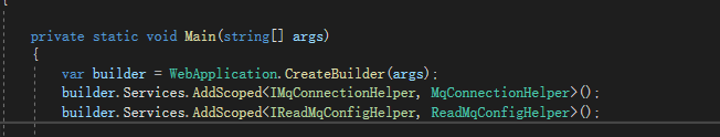1 var builder = WebApplication.CreateBuilder(args); 2 builder.Services.AddScoped<IMqConnectionHelper, MqConnectionHelper>(); 3 builder.Services.AddScoped<IReadMqConfigHelper, ReadMqConfigHelper>();