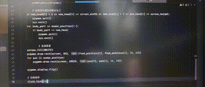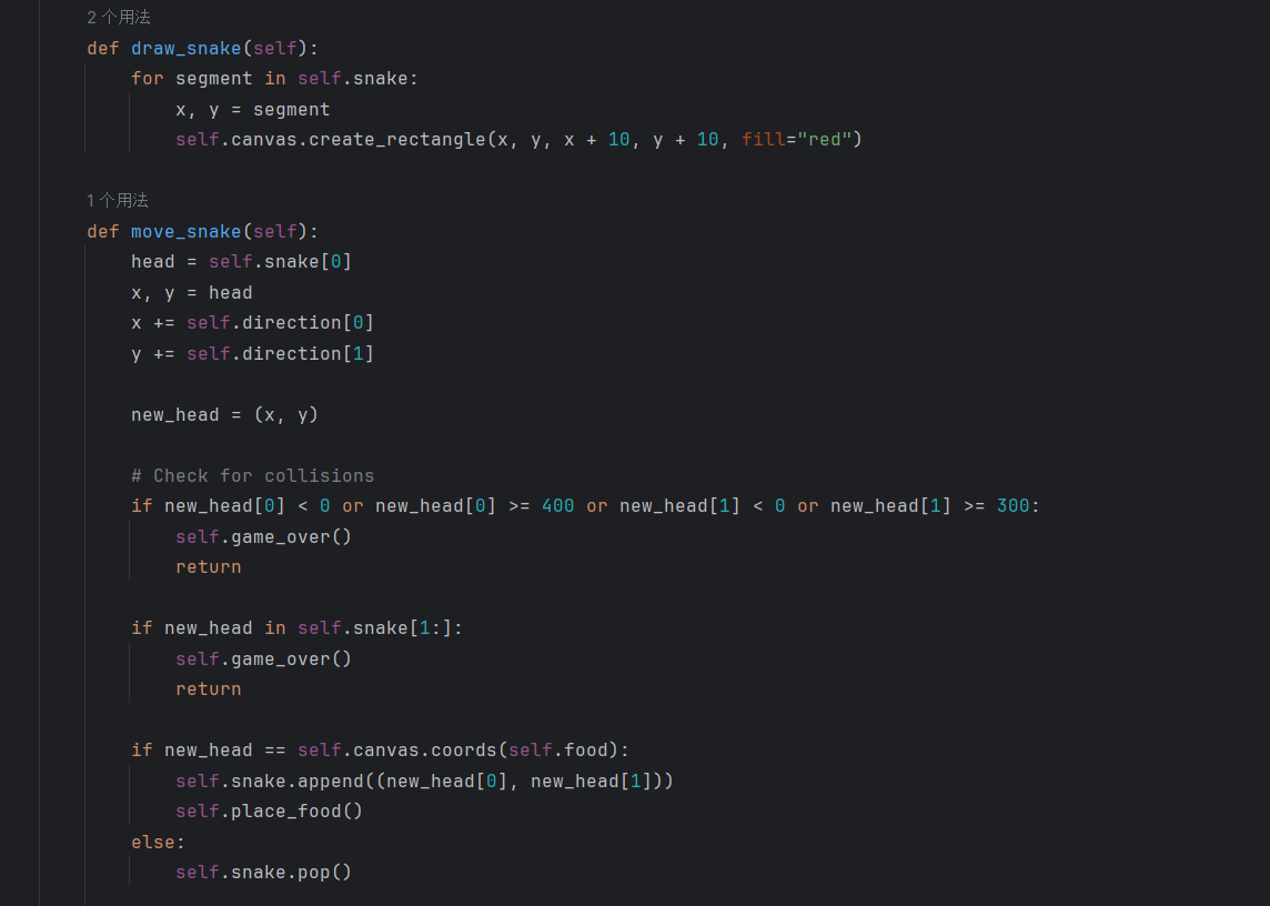 当蛇头(new_head)与食物坐标重合时,不执行蛇尾删除操作(即不调用snake.pop()),直接将新蛇头坐标添加至列表。
