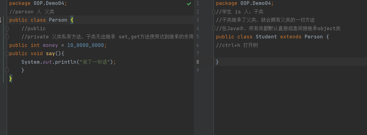 在下图中,person人类为父类,student学生类为子类;父类有的money数据以及say()方法,可以通过主函数在子函数中调用,如果是父类私有的则不能直接继承,需要用set与get方法后进行调用;
