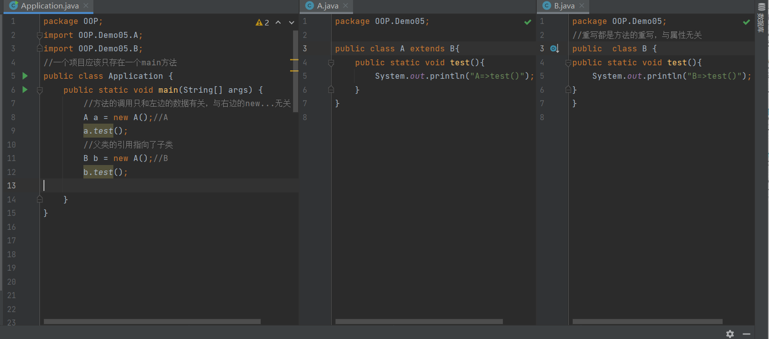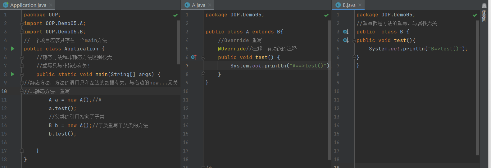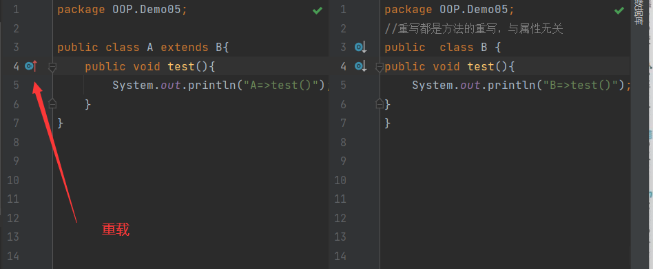 将A和B中的test方法全部变为非静态的,会发现出现“O”的标志,代表重载;