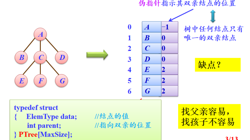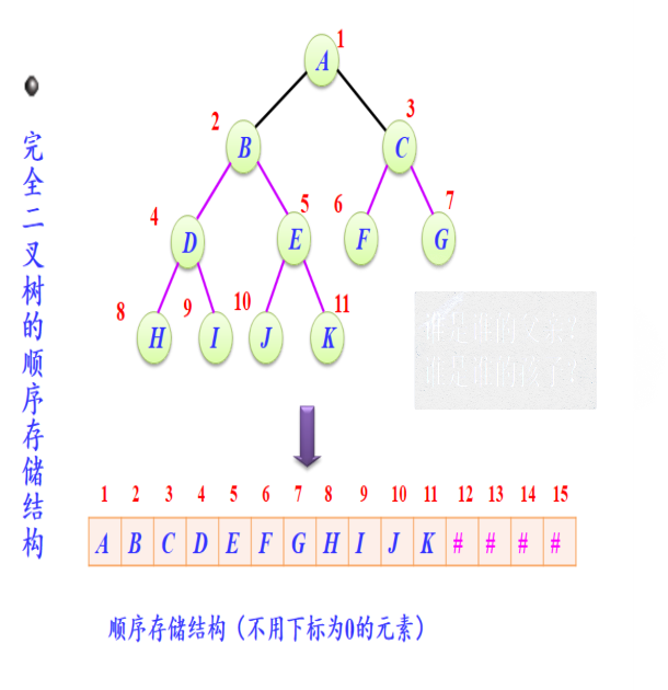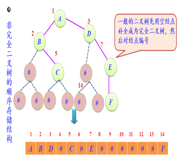 - 二叉树的顺序存储结构:用一组地址连续的存储单元来存放二叉树的数据元素,因此必须确定好树中各数据元素的存放次序,使得各数据元素在这个存放次序中的相互位置能反映出数据元素之间的逻辑关系。