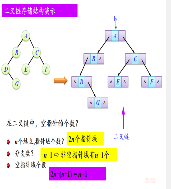 - 二叉链存储结构时,每个节点总有两个指针域,总共有2n个指针域。