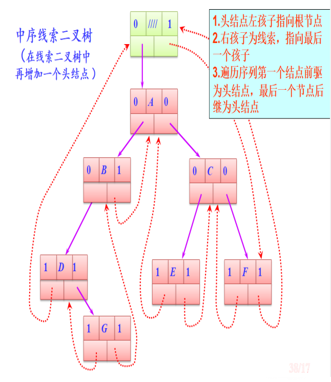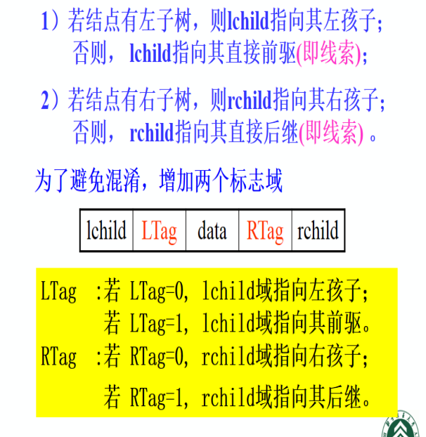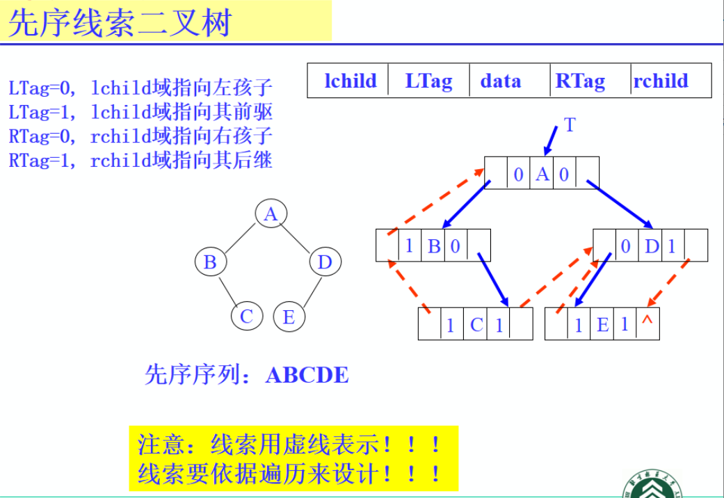- 利用这些空指针域,指向该线性序列中的“前驱”和“后继”的指针,称作线索。