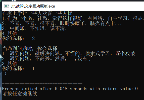 printf("2. 遇到问题, 不高兴。然后,...,没有了.\n");