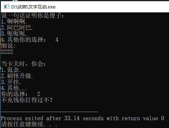 printf("2. 不喜,不喜,很不喜. 眼睛快瞎了. 脑壳有点卡...\n");