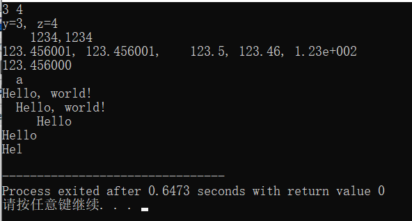 #include <stdio.h> int main() { int x=1234; float f=123.456; double m=123.456; char ch='a'; char a[]="Hello, world!"; int y=3, z=4; printf("%d %d\n", y, z); printf("y=%d, z=%d\n", y,z); printf("%8d,%2d\n", x,x); printf("%f, %8f, %8.1f, %0.2f, %.2e\n",f,f,f,f,f); printf("%lf\n",m); printf("%3c\n", ch); printf("%s\n%15s\n%10.5s\n%2.5s\n%.3s\n",a,a,a,a,a); return 0; }