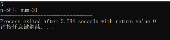 #include<stdio.h> #include<math.h> int main(){ int n; double sum; scanf("%d",&n); sum=pow(2,n)-1; printf("n=""%d",n); printf("时,sum=""%.0lf",sum); return 0; }