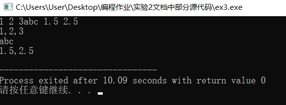 #include <stdio.h> int main() { double x,y; char c1,c2,c3; int a1,a2,a3; scanf("%d%d%d",&a1,&a2,&a3); printf("%d,%d,%d\n",a1,a2,a3); scanf("%c%c%c",&c1,&c2,&c3); printf("%c%c%c\n",c1,c2,c3); scanf("%lf%lf",&x,&y); printf("%.1lf,%.1lf\n",x,y); return 0; }