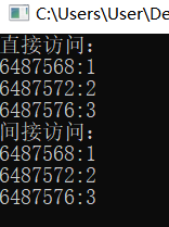 #include<stdio.h> const int N=3; int main() { int a[N]={1,2,3}; int i=1; printf("直接访问:\n"); for(i=0;i<N;i++) printf("%d:%d\n",&a[i],a[i]); printf("间接访问:\n"); for(i=0;i<N;i++) printf("%d:%d\n",a+i,*(a+i)); return 0; }