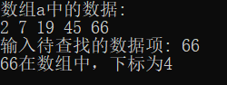 #include <stdio.h> const int N=5; int binarySearch(int *x, int n, int item); // 函数声明 int main() { int a[N]={2,7,19,45,66}; int i,index, key; printf("数组a中的数据:\n"); for(i=0;i<N;i++) printf("%d ",a[i]); printf("\n"); printf("输入待查找的数据项: "); scanf("%d", &key); // 调用函数binarySearch()在数组a中查找指定数据项key,并返回查找结果给index // 补足代码① index=binarySearch(a,N,key); if(index>=0) printf("%d在数组中,下标为%d\n", key, index); else printf("%d不在数组中\n", key); return 0; } //函数功能描述: //使用二分查找算法在从x中查找特定值item,数组x大小为n // 如果找到,返回其下标 // 如果没找到,返回-1 int binarySearch(int *x, int n, int item) { int low, high, mid; low = 0; high = n-1; while(low <= high) { mid = (low+high)/2; if ( item == *(x+mid) ) return mid; else if(item < *(x+mid)) high = mid - 1; else low = mid + 1; } return -1; }