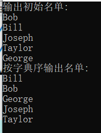 #include <stdio.h> #include<string.h> const int N = 5; void selectSort(char str[][20], int n ); // 函数声明,形参str是二维数组名 int main() { char name[][20] = {"Bob", "Bill", "Joseph", "Taylor", "George"}; int i; printf("输出初始名单:\n"); for(i=0; i<N; i++) printf("%s\n", name[i]); selectSort(name, N); // 调用选择法对name数组中的字符串排序 printf("按字典序输出名单:\n"); for(i=0; i<N; i++) printf("%s\n", name[i]); return 0; } // 函数定义 // 函数功能描述:使用选择法对二维数组str中的n个字符串按字典序排序 void selectSort(char str[][20], int n) { int i, j, k; char temp[20]; for(i=0; i<n-1; i++) { k = i; for(j=i+1; j<n; j++) if (strcmp(str[j],str[k])<0) k = j; if(k != i) { strcpy(temp,str[i]); strcpy(str[i],str[k]); strcpy(str[k],temp); } } }