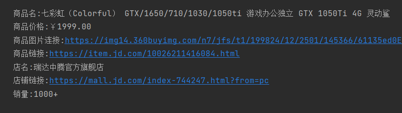 # img的src属性存在懒加载现象,src没有就在data-lazy—img属性下 # 如果src不存在 if not img_src: img_src = 'https' + bro.find_element_by_css_selector('div.p-img img').get_attribute('data-lazy-img') # 商品名 thing_name=li.find_element_by_css_selector('div.p-name a em').text # 商品价格 thing_price=li.find_element_by_css_selector('div.p-price strong').text # 商品连接 thing_link=li.find_element_by_css_selector('div.p-name a').get_attribute('href') # 销量 thing_pay=li.find_element_by_css_selector('div.p-commit strong a').text # 店名 shop_name=li.find_element_by_css_selector('div.p-shop span a').text # 电商连接 shop_link=li.find_element_by_css_selector('div.p-shop span a').get_attribute('href') # 输出结果 print(''' 商品名:%s 商品价格:%s 商品图片连接:%s 商品链接:%s 店名:%s 店铺链接:%s 销量:%s '''%(thing_name,thing_price,img_src,thing_link,shop_name,shop_link,thing_pay)) break