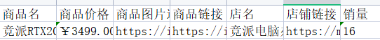 from openpyxl import Workbook # 创建表格对象 wb = Workbook() # 创建工作簿 wb1=wb.create_sheet('商品',0) # 插入表头 wb1.append(["商品名","商品价格","商品图片连接","商品链接","店名","店铺链接","销量"]) # 滚动加载数据,数据源于网页长度 for i in range(0, 11810, 1000): wb1.append([thing_name,thing_price,img_src,thing_link,shop_name,shop_link,thing_pay]) break wb.save(r'商品.xlsx')