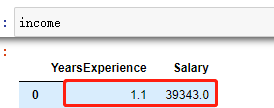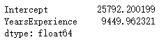 # 调用模块 import pandas as pd import statsmodels.api as sm # 读取文件 income = pd.read_csv('Salary_Data.csv') # 利⽤收⼊数据集,构建回归模型 infom = sm.formula.ols('Salary ~ YearsExperience', data = income).fit() # 返回模型的参数值 infom.params