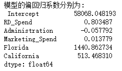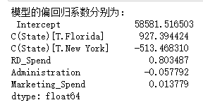 # ⽣成由State变量衍⽣的哑变量 dump = pd.get_dummies(Profit.State) # 将哑变量与原始数据集⽔平合并 new_date = pd.concat([Profit,dump], axis = 1) # 删除State变量和California变量(因为State变量已被分解为哑变量,New York变量需要作为参照组) new_date.drop(labels = ['State','New York'], axis = 1, inplace = True) # 拆分数据集Profit_New train, test = model_selection.train_test_split(new_date, test_size = 0.2, random_state=1234) # 建模 model2 = sm.formula.ols('Profit~RD_Spend+Administration+Marketing_Spend+Florida+California',data = train).fit() print('模型的偏回归系数分别为:\n', model2.params)
