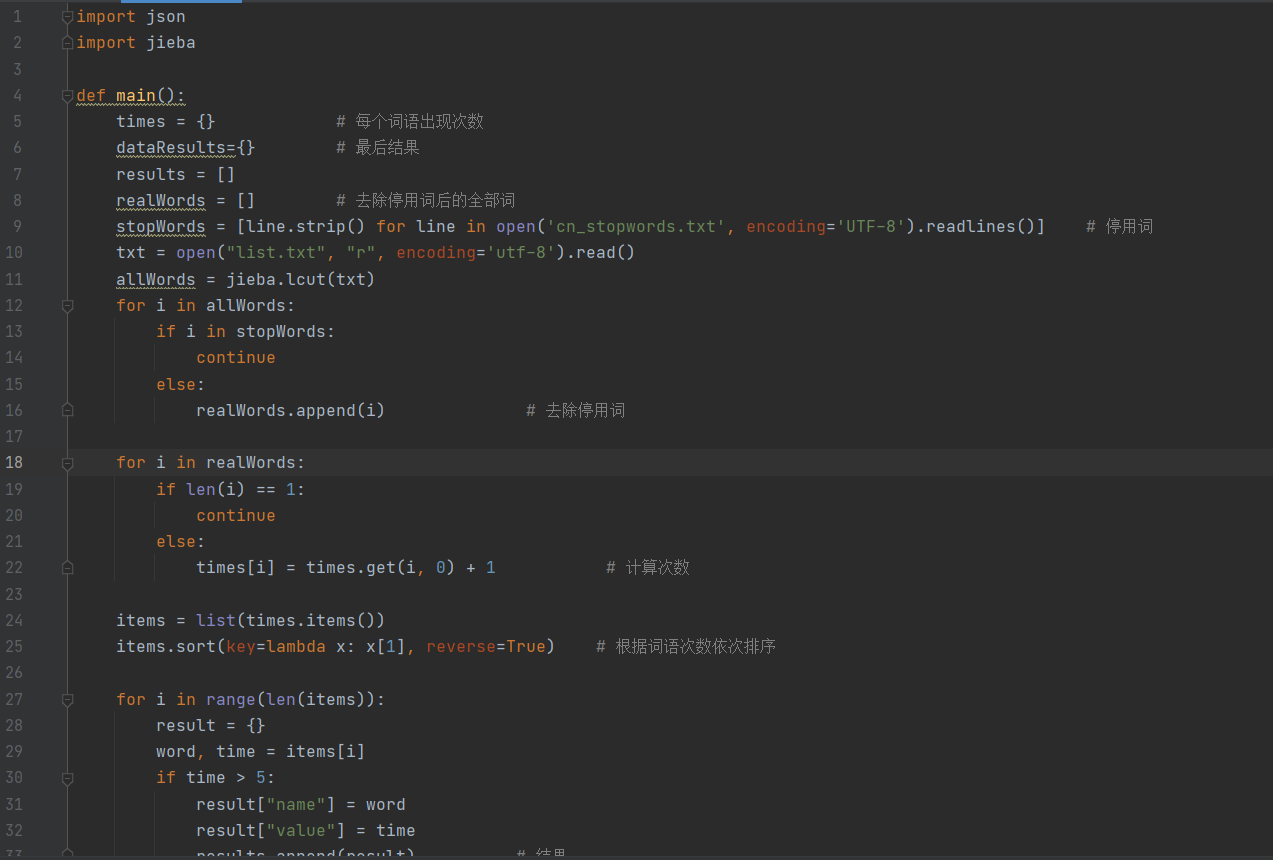 使用jieba库进行分词处理,因为是第一次接触然后比较不熟悉,在研究上面花费了不少时间,到网上找了一些常用的停词表,然后编写代码进行分词处理,将前面爬取的评论处理保存