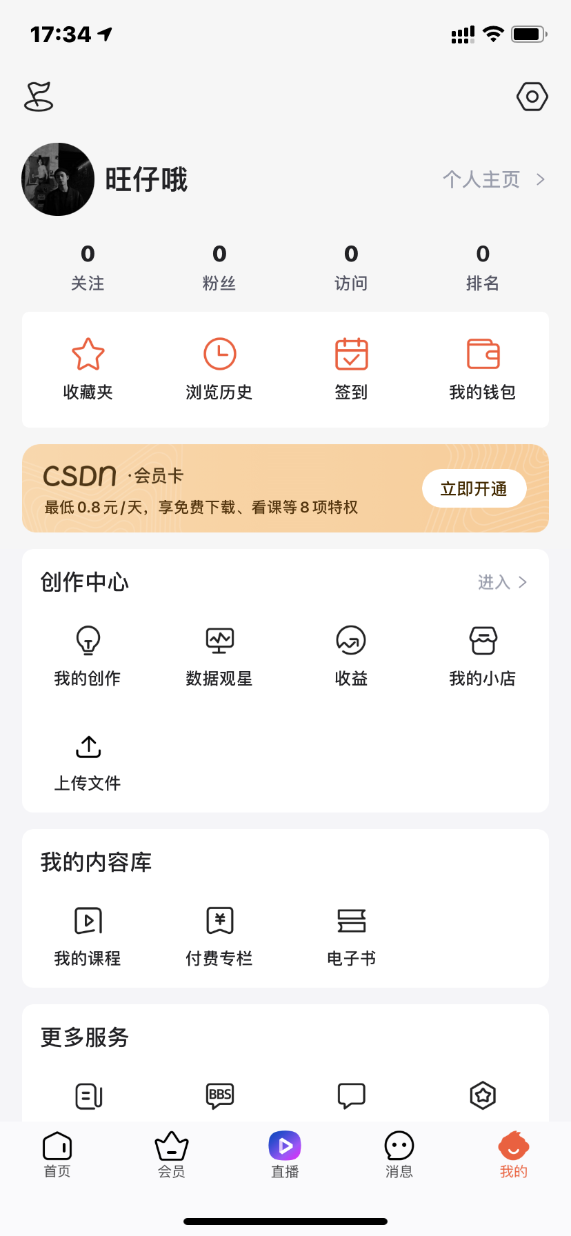 会员板块展示了会员的好处。直播板块让我们可以在线听讲学习知识。消息板块是用户个人的活动区域。我的板块里不仅有个人信息,还能看到创作信息以及更多不在前面的服务。
