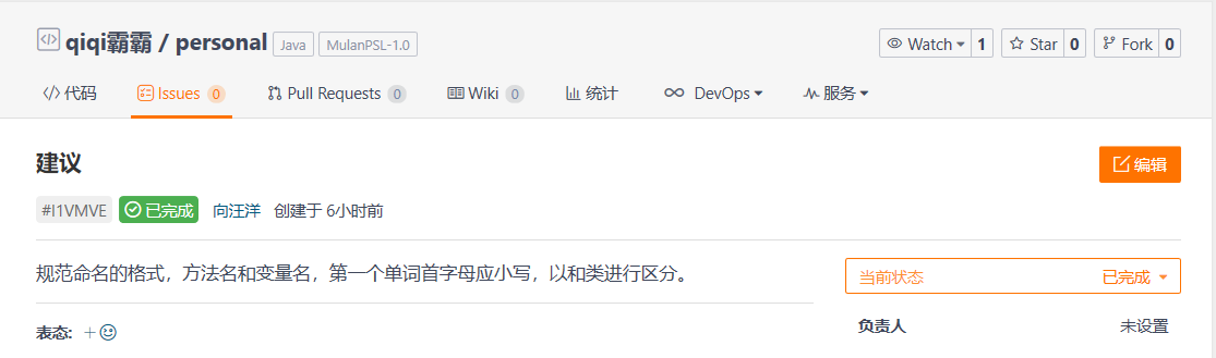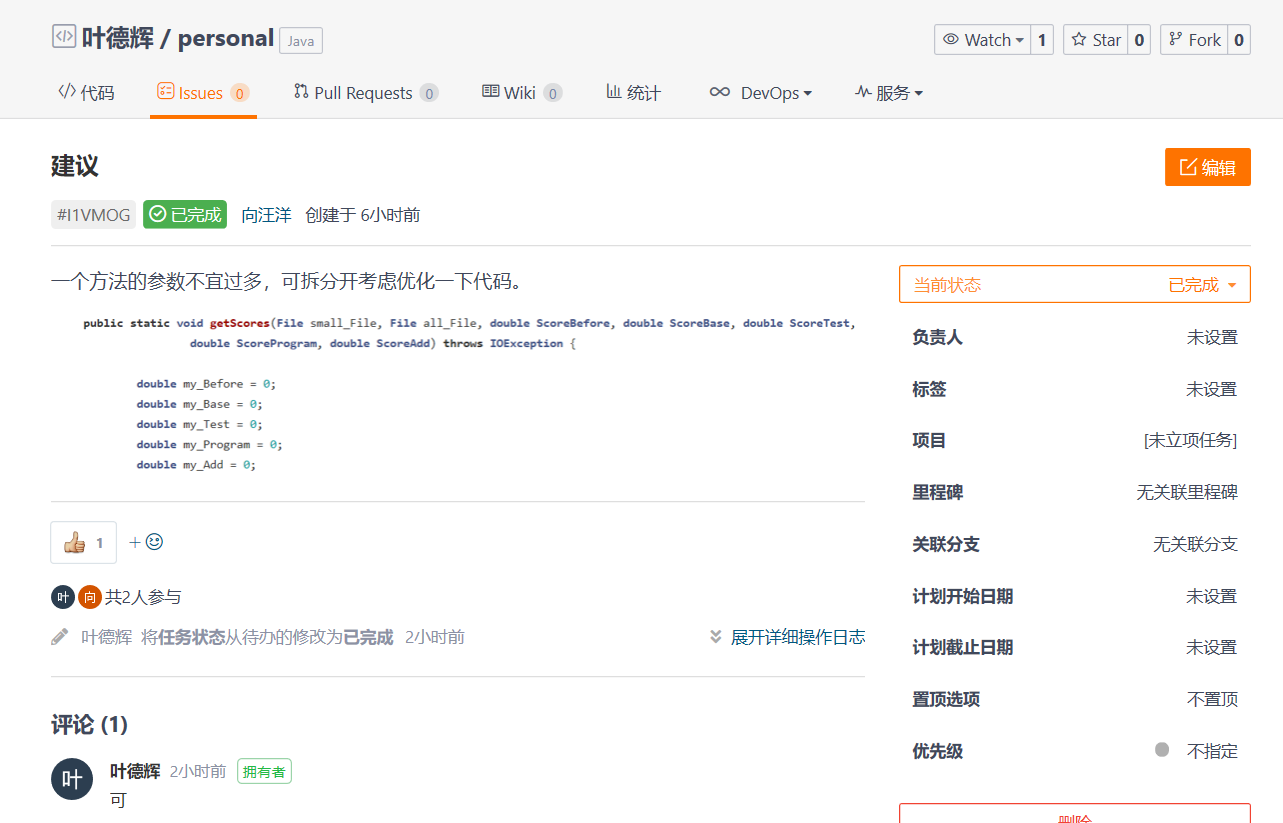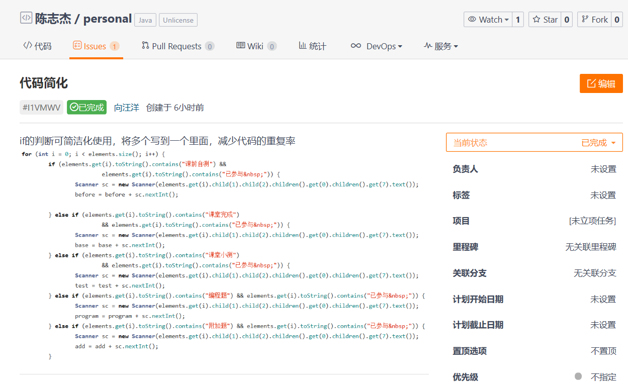 | 作业目标 | <对自己和别人的代码进行复审,重构和优化第一次编程作业的代码,指出别人的错误,对别人对自己提出的错误做出改正并重新提交到码云。> |
