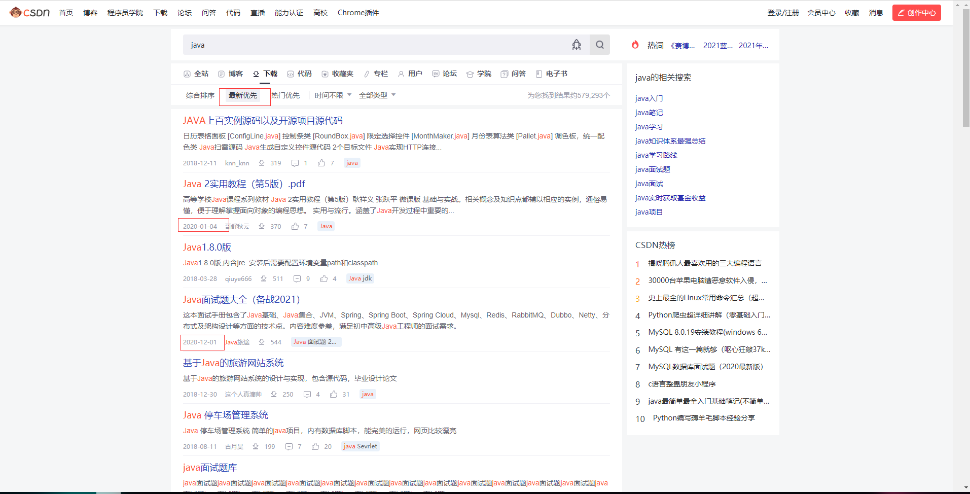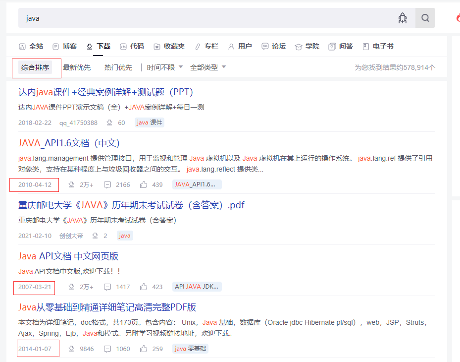 如下图搜索Java,默认综合排行,出现的时间节点都比较远