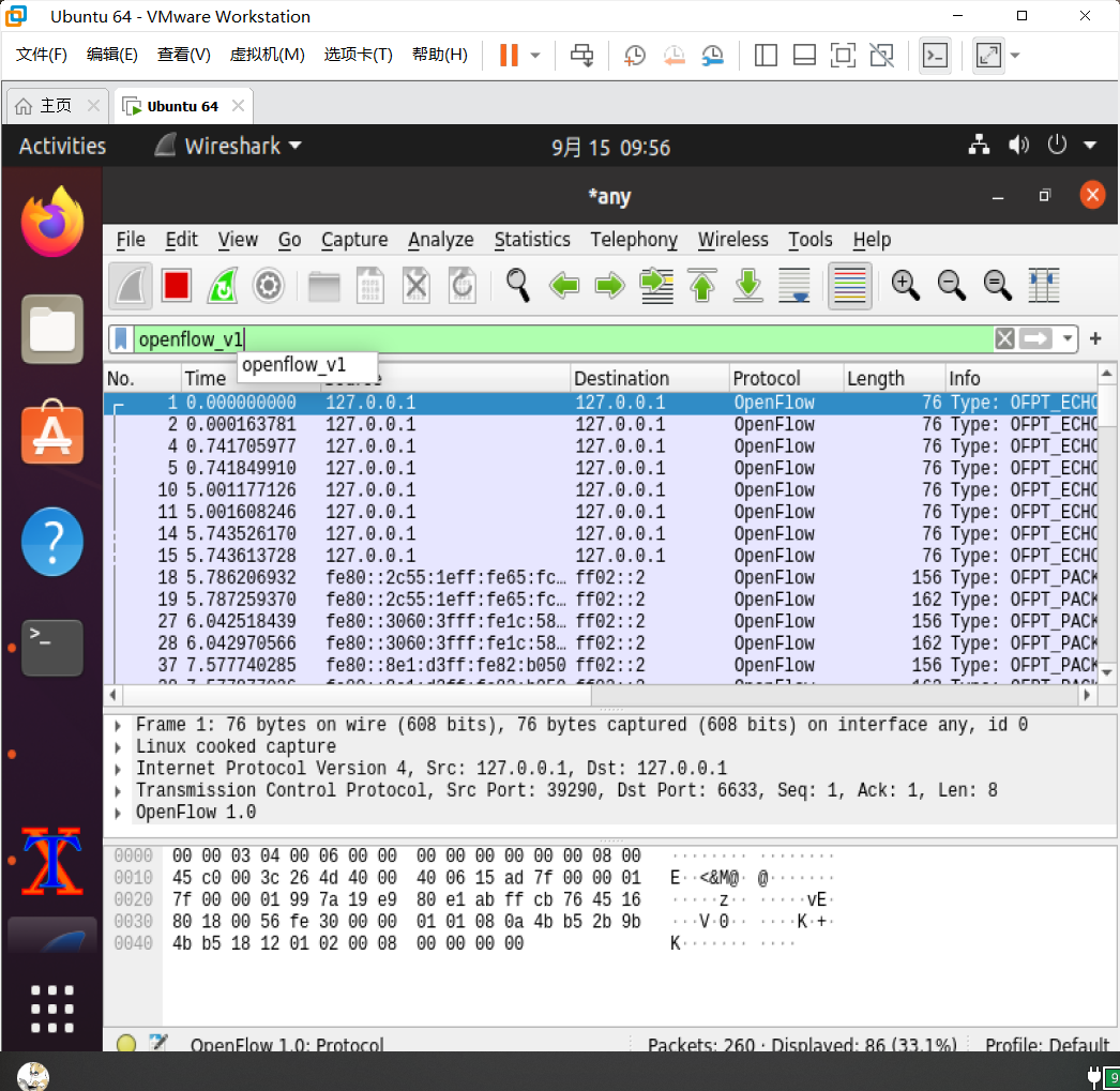 建好topo后直接run就抓包了,发现没有hello,问了同学之后知道hello是建立连接的,所以要在run之前就抓包,先抓在run,因为接口是一直都在抓,否则会来不及。