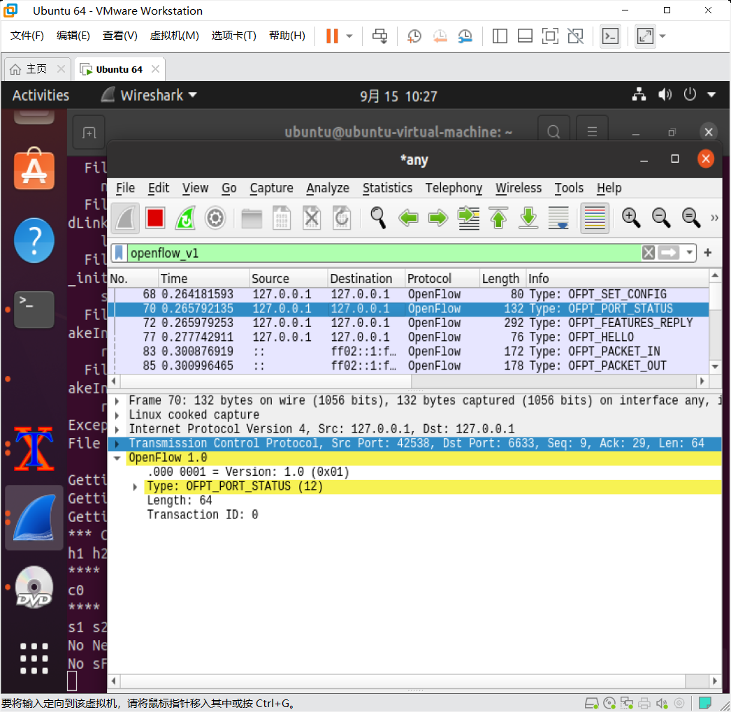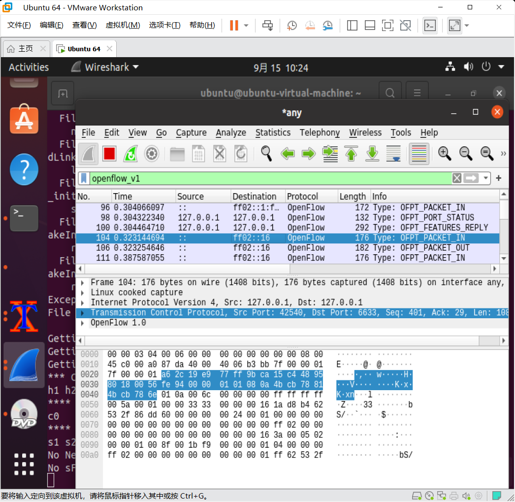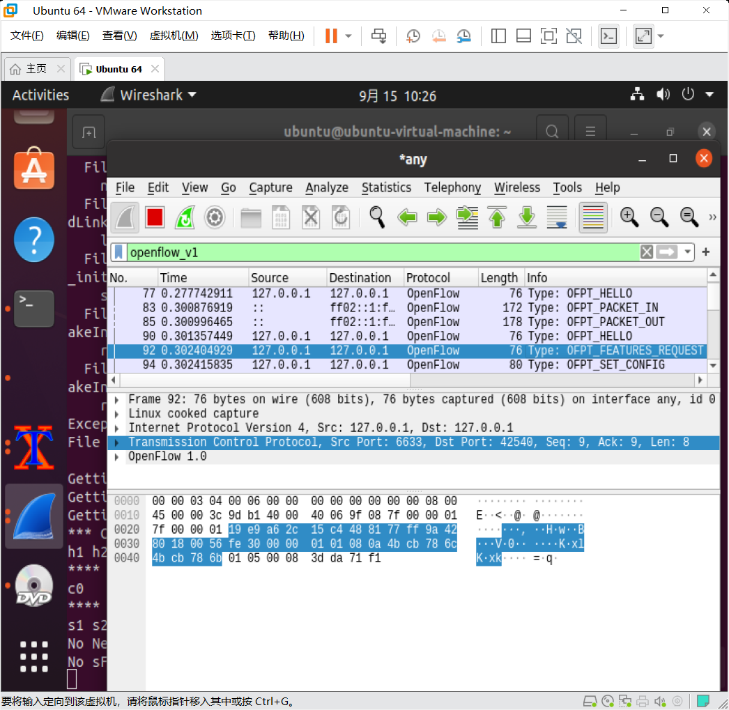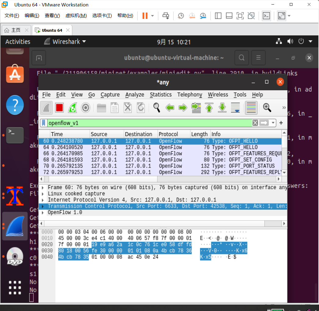 - 搭建下图所示拓扑,完成相关 IP 配置,并实现主机与主机之间的 IP 通信。用抓包软件获取控制器与交换机之间的通信数据包