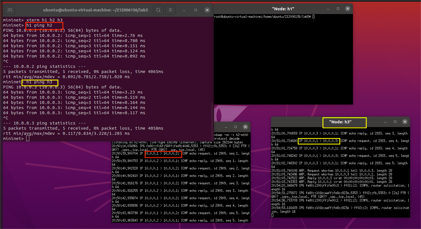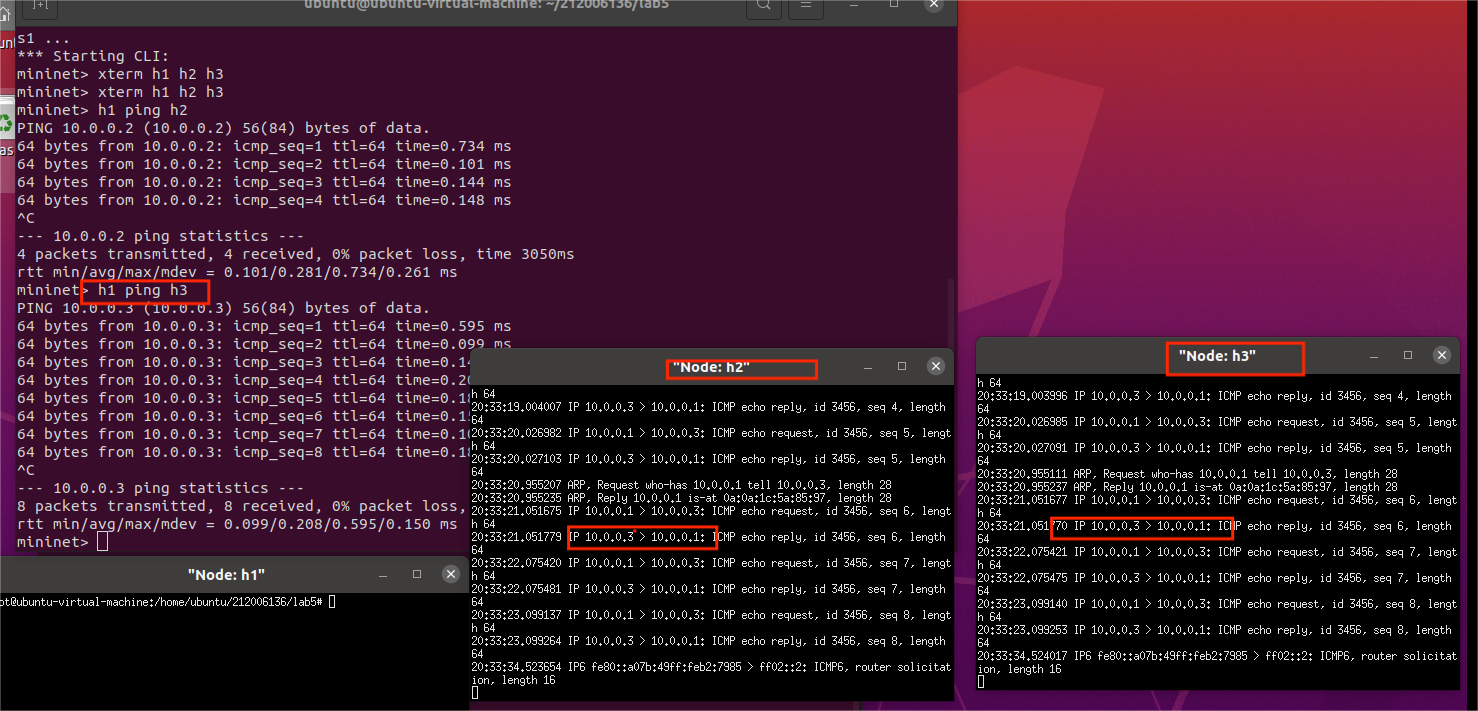 b)使用tcpdump验证Switch模块,h1 ping h2、h2和h3的tcpdump抓包结果截图