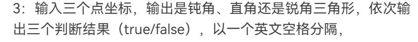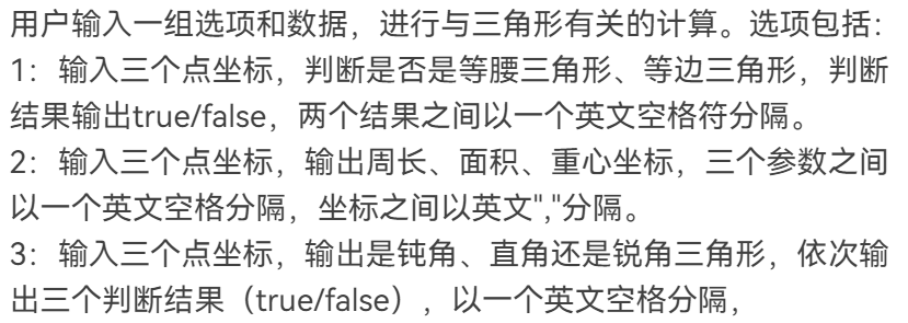 其实说白了这种题目就是考我们写方法的能力,因为在这个题目中我们只需要一个类,一个其中的属性是x1,y1,x2......的类。因为在这个题目中能进行判断的只有坐标上的点,这意味者我们只能通过这几个坐标来实现上面题目中的判断像什么锐角三角形,钝角三角形之类的。所以基础已经打好了,但不要忘了数据封装,这很重要。