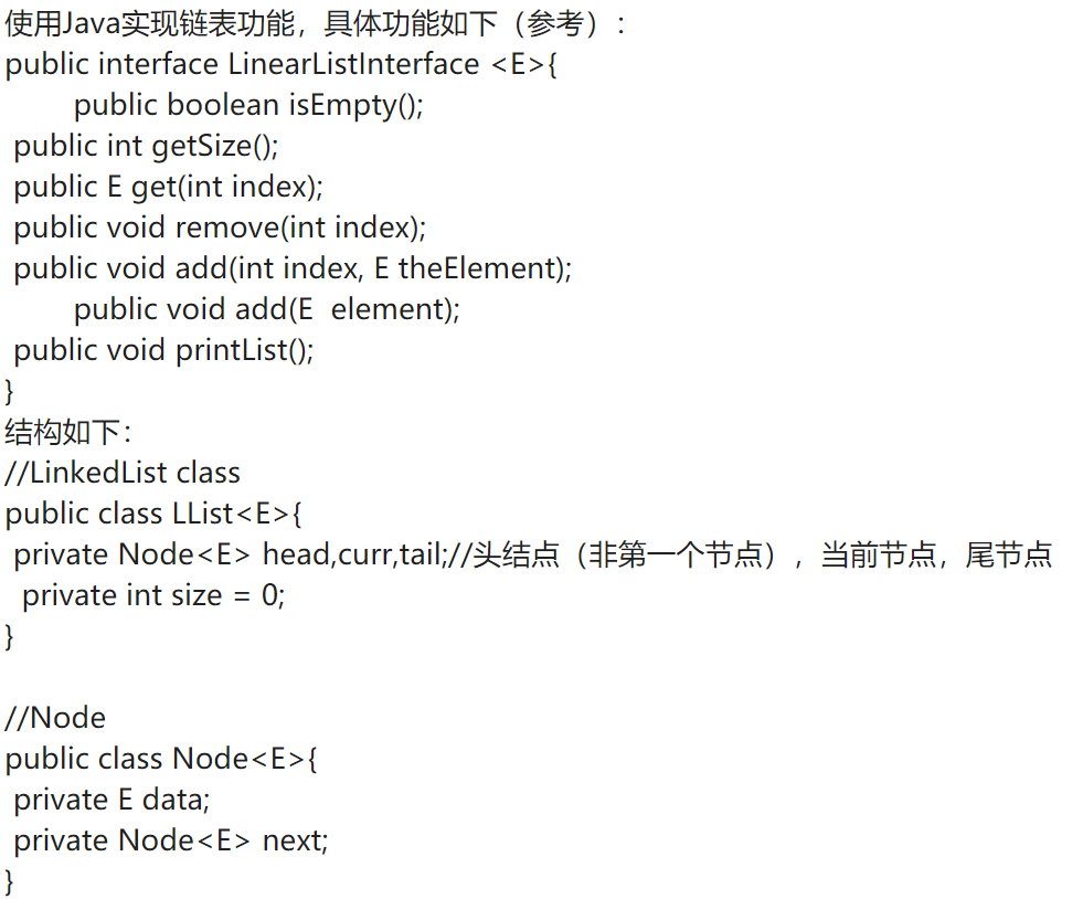 这个是我们老师自己布置给我们做的,没错他只讲了一点(相当于什么都没有讲),然后就叫我们写这个。怎么说呢,老师太高看我们了,我们不是生来就是很会写代码的,我连上面的的方法我都写不全,你让我写个链表,我能怎么办。但最后老师还是给我们展示了如何写一个链表,那就让我复述一下吧。首先,是接口的问题: