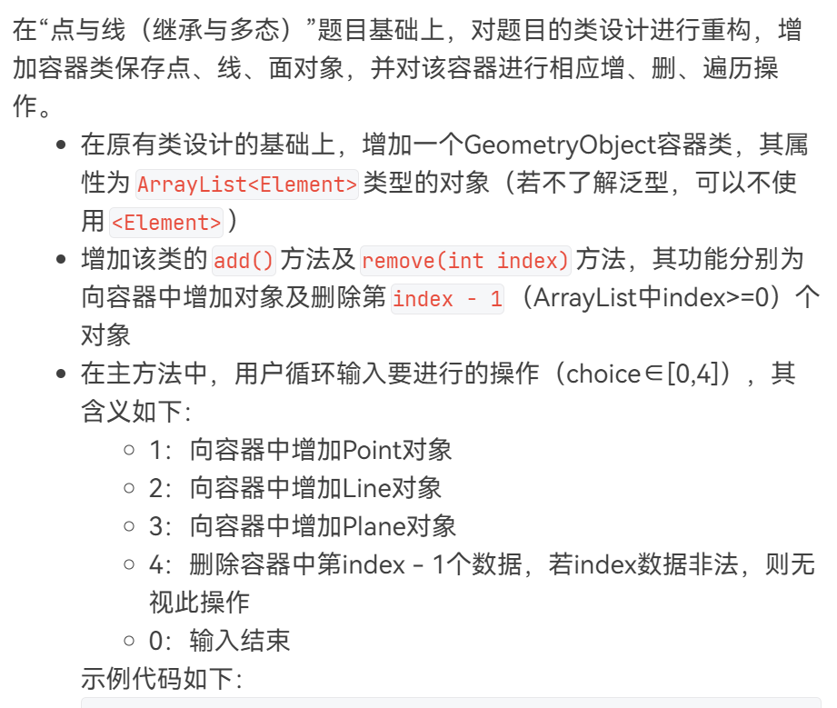 在这题中最要的是main类的写法和geometryobject的写法,因为在这个类中涉及到了remove的方法。其中还创建了链表,把element作为对象放入其中这样就可以更加简便的对数据进行删除。(我没有做出这题来所以也不是很清楚)