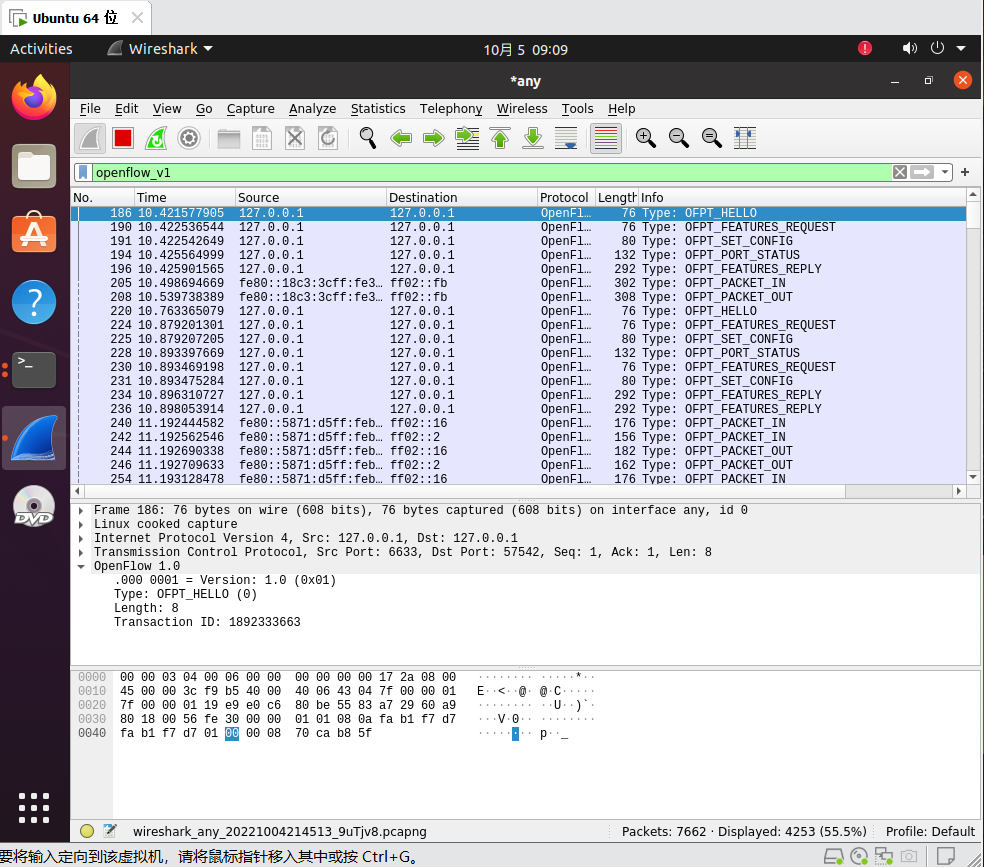 - 个人总结, 本次实验主要学习对于OpenFlow协议包的获取、解析,通过本次实验,对于OpenFlow协议的学习有了更深的理解,在观察交换机52554端口与控制器6633端口之间的Hello时使用wireshark,需要将过滤器改为openflow_v6才能看见数据包。