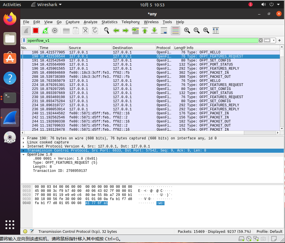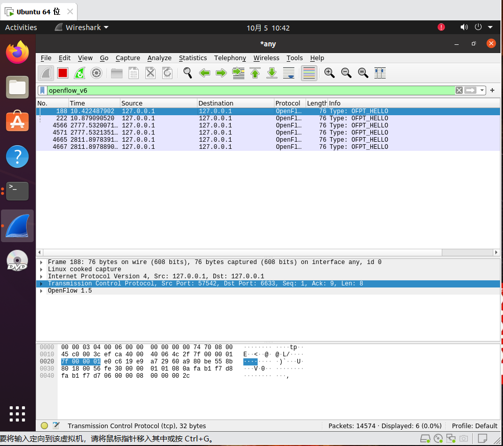控制器6633端口(我最高能支持OpenFlow 1.0) ---> 交换机57542端口