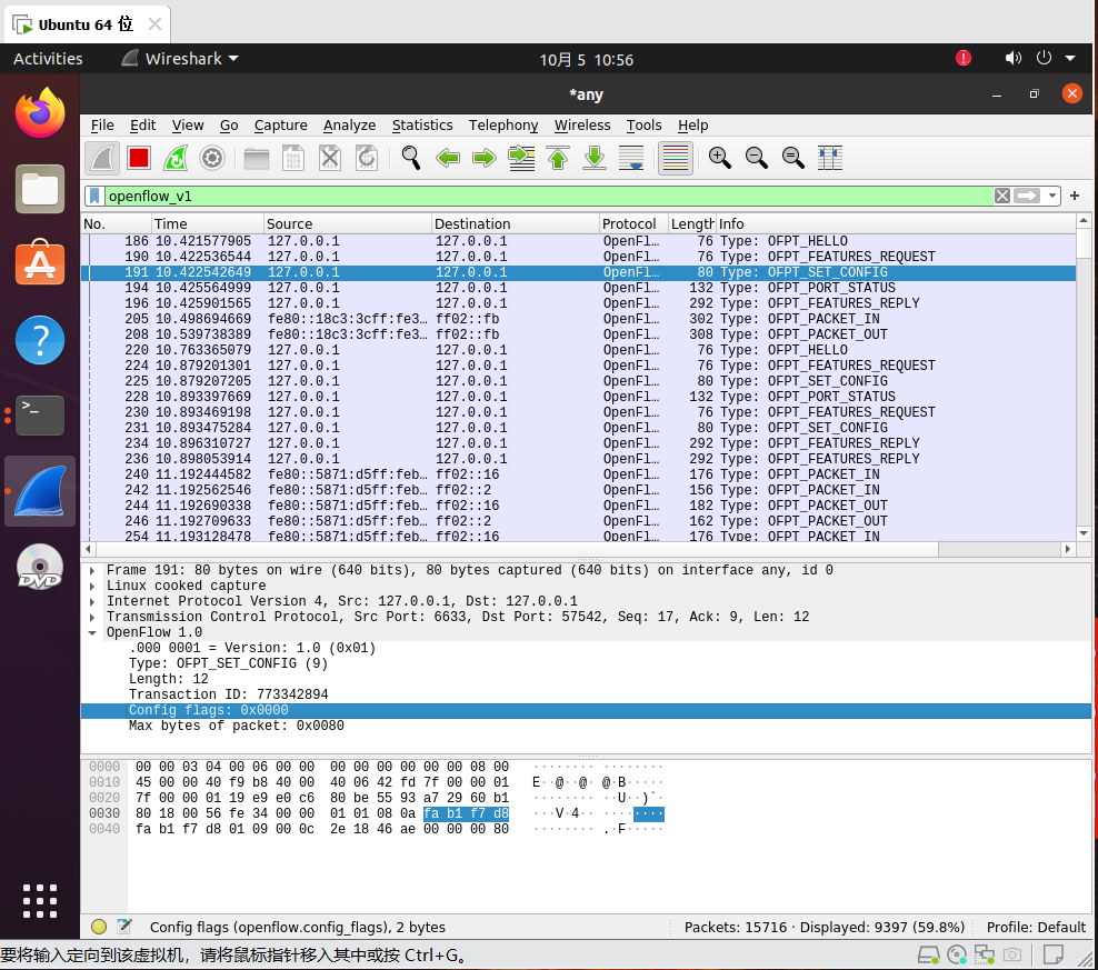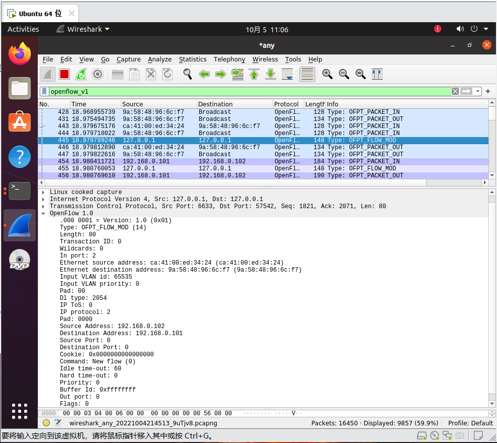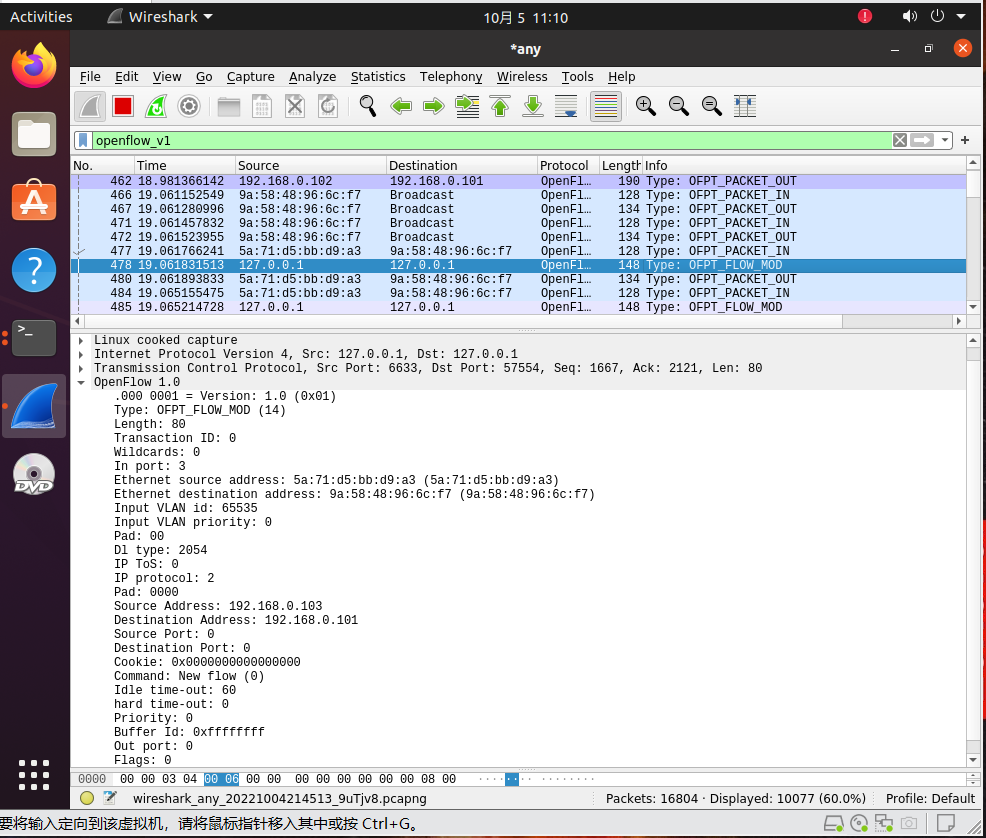 分析抓取的flow_mod数据包,控制器通过6633端口向交换机57542端口、交换机57554端口 下发流表项,指导数据的转发处理