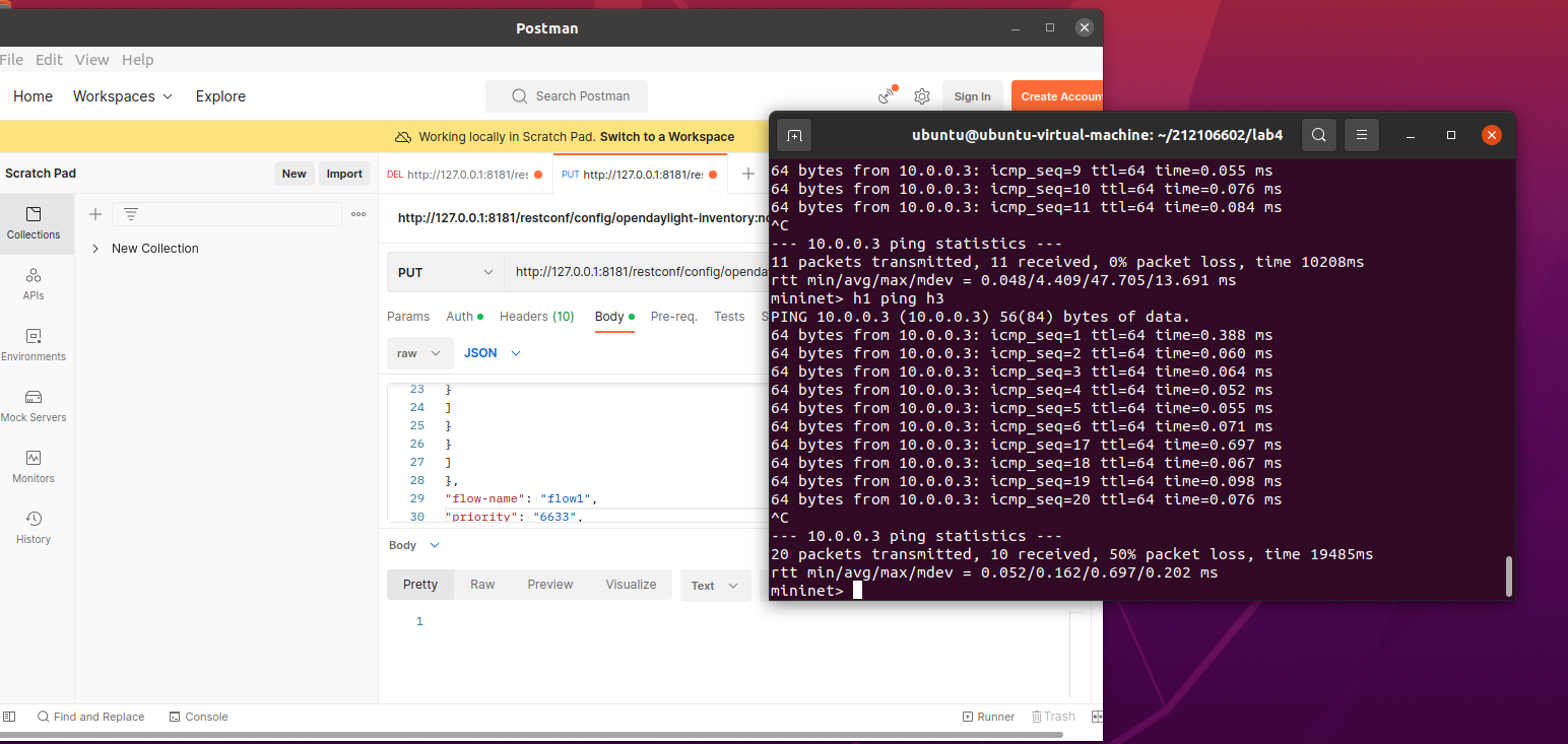 - 通过Postman工具调用OpenDaylight提供的API下发流表,实现拓扑内主机h1和h3网络中断10s。