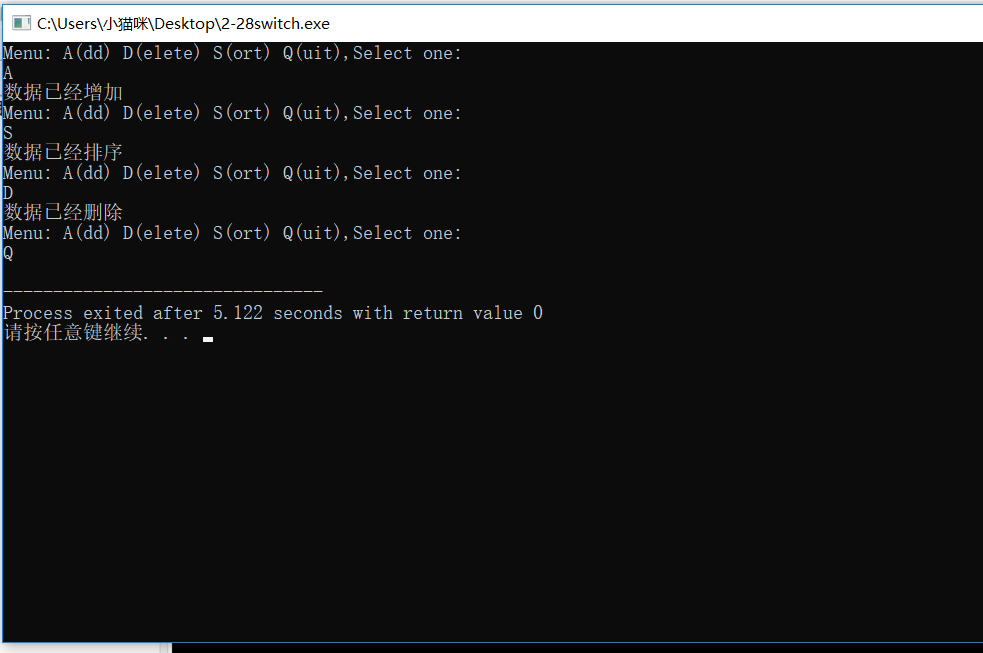 1 #include<iostream> 2 using namespace std; 3 int main() 4 { 5 while(true) 6 { 7 char n,A,Q,S,D; 8 cout << "Menu: A(dd) D(elete) S(ort) Q(uit),Select one:" << endl; 9 cin>>n; 10 switch(n) 11 { 12 case 'A':cout<< "数据已经增加" << endl;break; 13 case 'D':cout<< "数据已经删除" << endl;break; 14 case 'S':cout<< "数据已经排序" << endl;break; 15 case 'Q':return 0; 16 } 17 18 } 19 return 0; 20 }