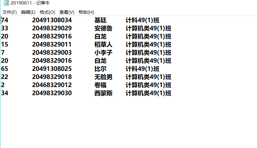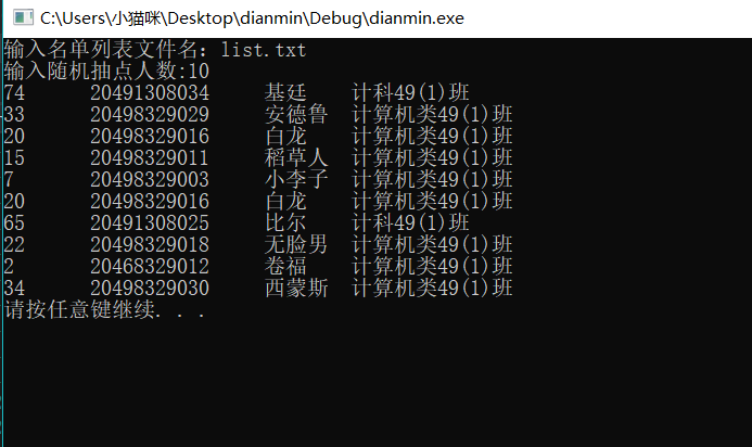 #include <iostream> #include <string> #include <cstdlib> #include<fstream> #include<ctime> #include "utils.h" char s[83][80]; using namespace std; int main() { int n, i, j, t; string fname; ifstream fin; ofstream fout; char c; srand((unsigned)time(NULL)); cout << "输入名单列表文件名:"; cin >> fname; cout << "输入随机抽点人数:"; cin >> n; fin.open(fname); for (i = 0; i < 83; i++) { for (j = 0; j < 80; j++) { c = fin.get(); s[i][j] = c; if (c == '\n') break; } } fin.close(); fout.open(getCurrentDate()); for (i = 0; i < n; i++) { t= rand() % 83+1; cout << s[t]; fout<< s[t]; } fout.close(); system("pause"); return 0; }