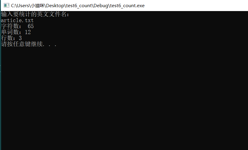 #include "pch.h" #include<iostream> #include<fstream> #include<string> using namespace std; int main() { char fname[100]; cout << "输入要统计的英文文件名:" << endl; cin.getline(fname, 100); fstream fout(fname, ios::in); fstream fin(fname); char ch; int c= 0; int i = 0; string d; while (fin && fin.get(ch)) { c++; } fin.close(); cout << "字符数: " << c-2<< endl; int word = 0; char str1[100]; ifstream in(fname); while (!in.eof()) { in >> str1; word++; } cout << "单词数:" << word << endl; in.close(); ifstream infile(fname); int n = 0; while (!infile.eof()) { infile.getline(fname, sizeof(fname));//默认终止标识符为‘\n’ n++; } cout << "行数:" << n << endl; fout.close(); system("pause"); return 0; }