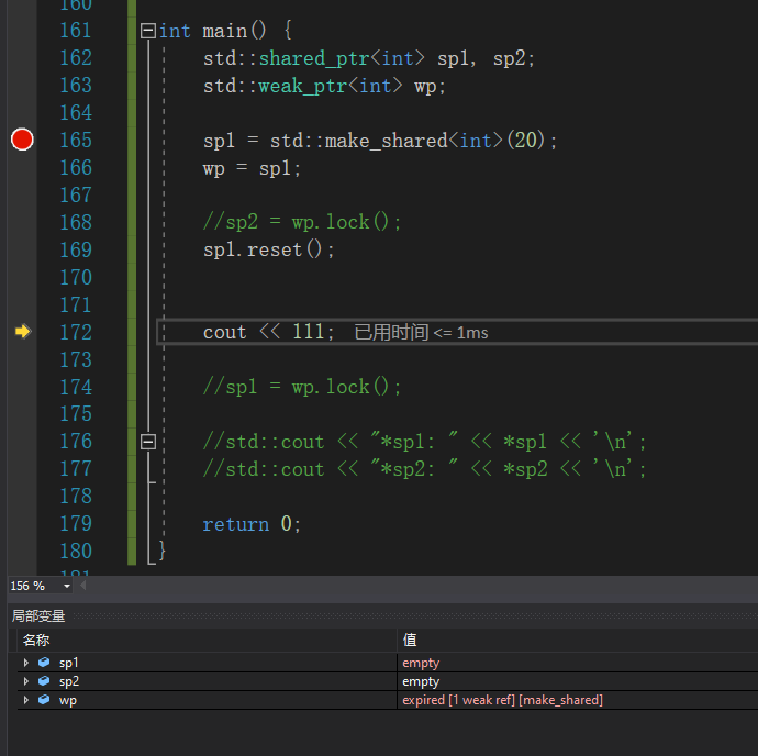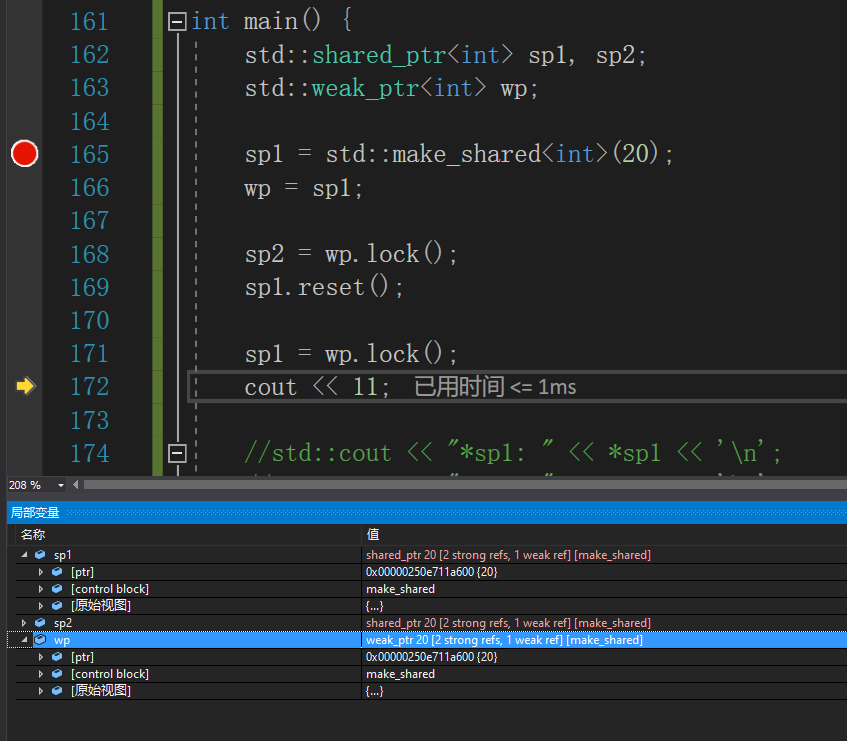 int main() { std::shared_ptr<int> sp1, sp2; std::weak_ptr<int> wp; sp1 = std::make_shared<int>(20); wp = sp1; //sp2 = wp.lock(); sp1.reset(); cout << 111; //sp1 = wp.lock(); std::cout << "*sp1: " << *sp1 << '\n'; std::cout << "*sp2: " << *sp2 << '\n'; return 0; }